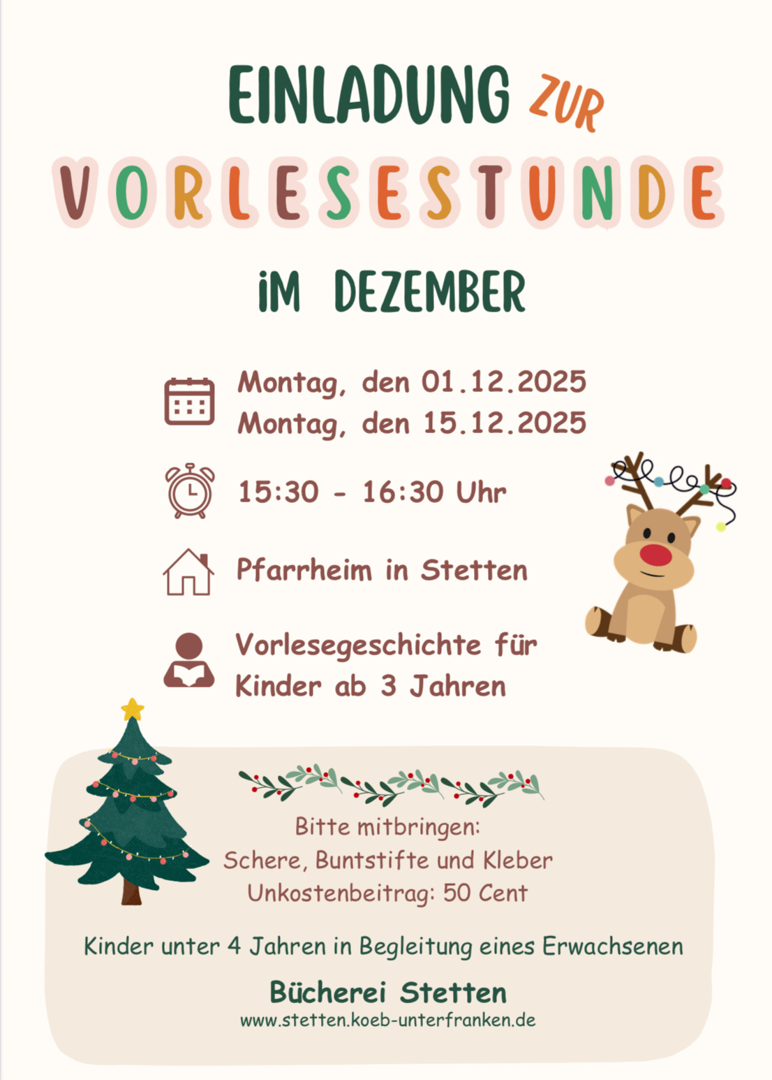 Am 01.12.2025 findet im Pfarrheim in Stetten unsere gewohnte Vorlesestunde statt.