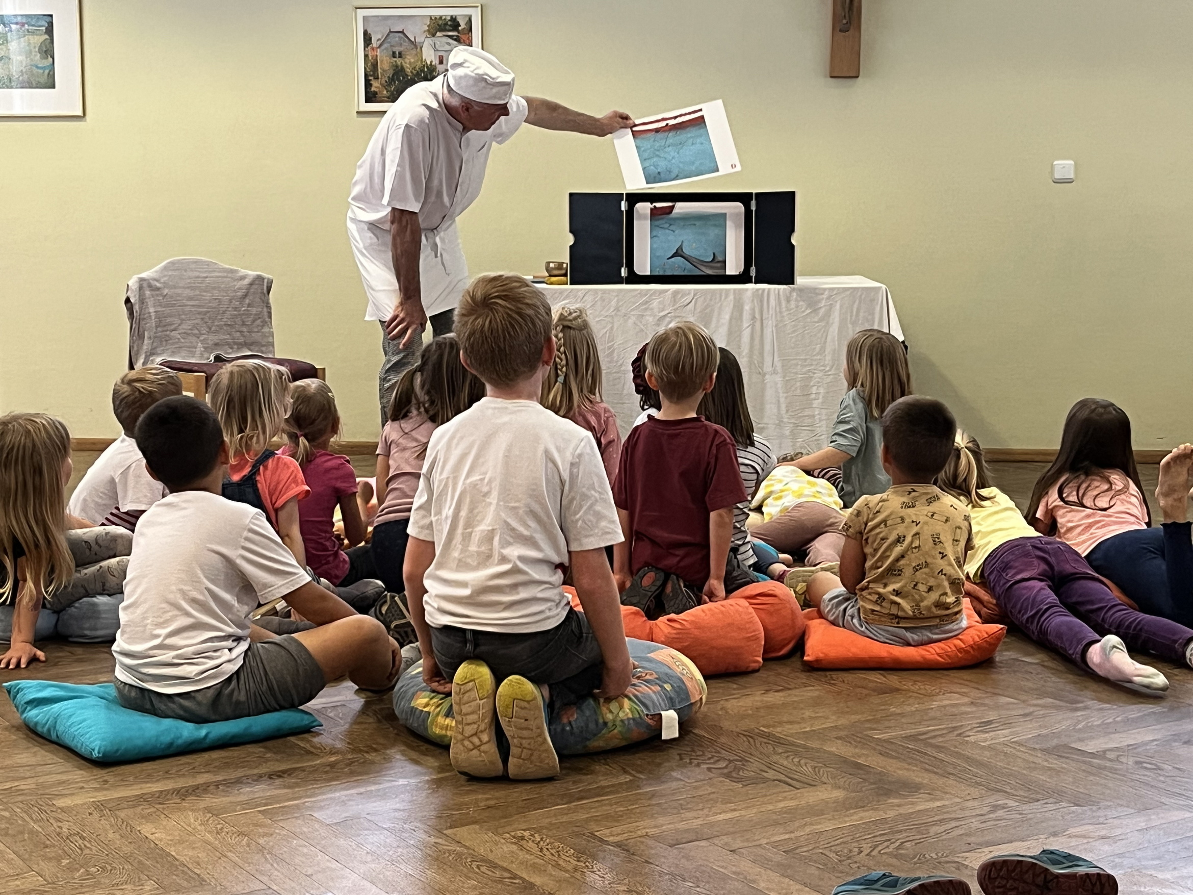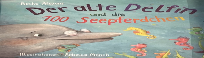 Alwan liest die Geschichte "Der alte Delfin und 100 Seepferdchen vor.
